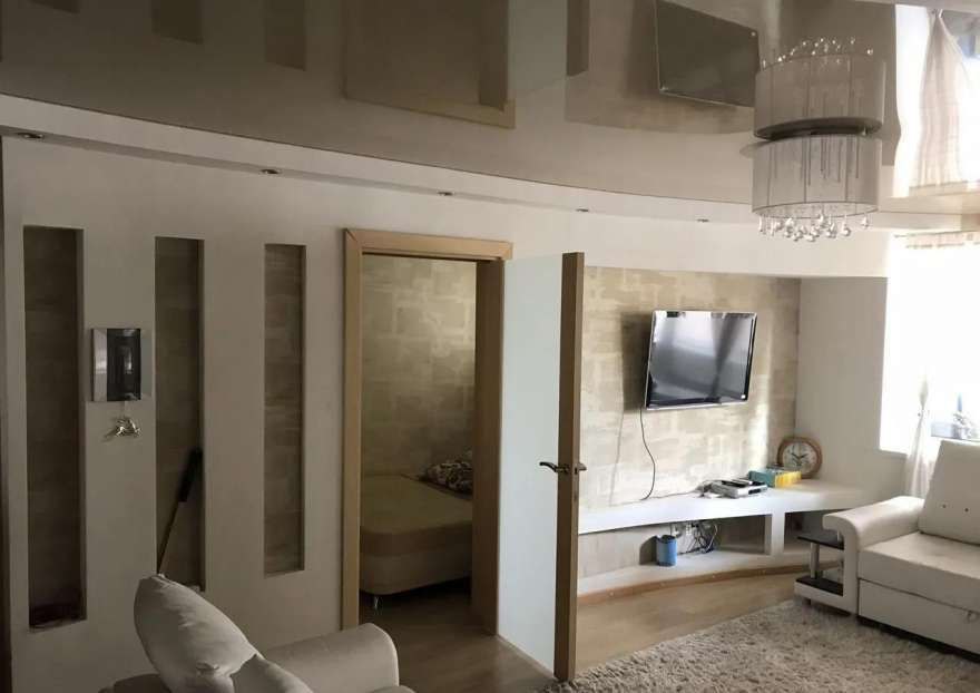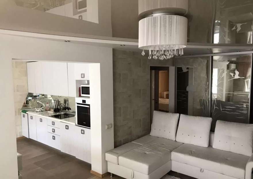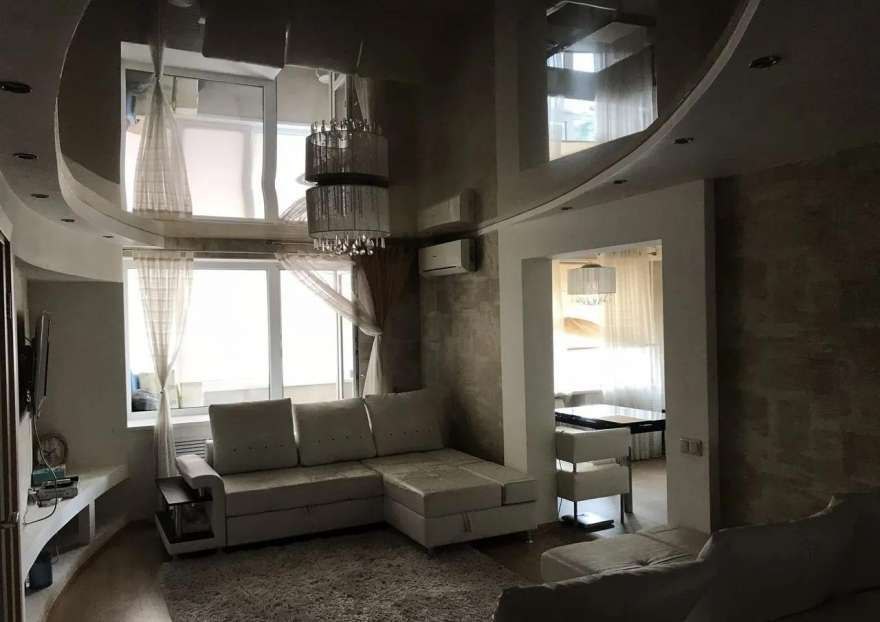 У меня гостиная не слишком большая, поэтому было желание визуально ее вытянуть. Заказал двухуровневый потолок с глянцевой поверхностью и светильниками по контуру. Желаемого эффекта добился, доволен.
